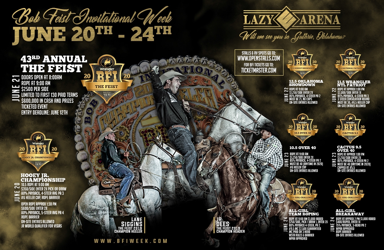 By just seven hundredths of a second over six steers, professional team ropers Kal Fuller of Bozeman, Montana, and Reagan Ward of Purcell, Oklahoma, won the richest event of their sport and split a first-place paycheck worth a record $150,000 at the 43rd Annual Bob Feist Invitational. The event is part of Wrangler BFI Week presented by Yeti, held for the first time inside the Lazy E Arena in Guthrie, Oklahoma, since its usual venue in Reno, Nevada, was shut down due to the pandemic.