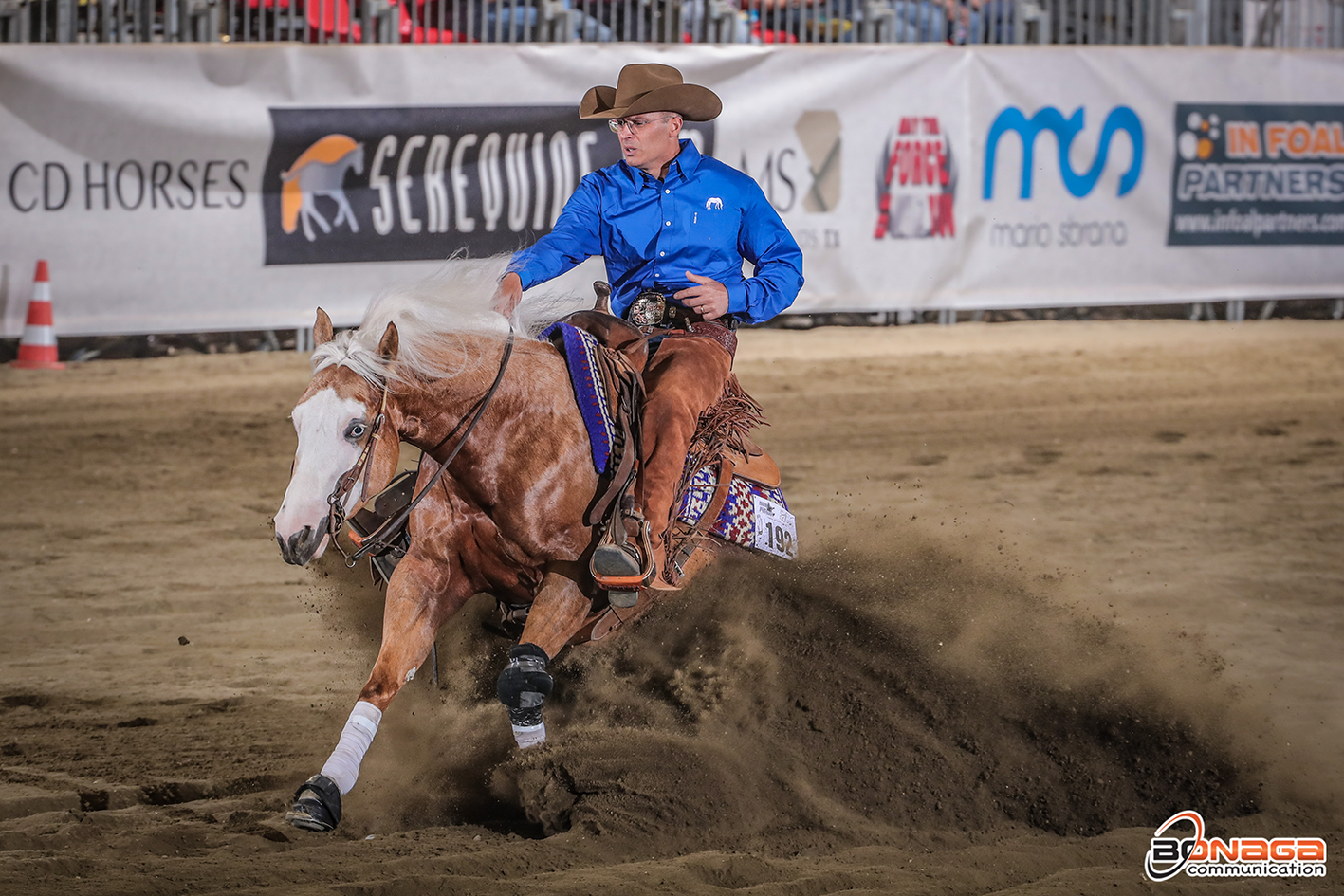 Cremona, May 17–The first go round of the €204.000,00-added Arcese/MS Diamonds TX 2020 Italian Reining Horse Association (IRHA) Open Futurity, eligible for horses by stallions nominated in the Italian Reining Horse Breeders Association (IRHBA) incentive program, filled the day in Cremona, Italy, where the event is held concurrently with the 2020 NRHA European Futurity and ELEMENTA Italian Reining Championship Finals.