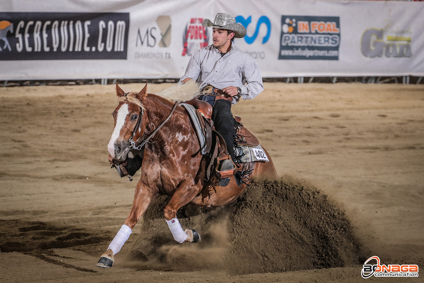 Twenty-two-year-old Gabriele Landi and Eyal Carmon’s Fancy Flashes (NRHA Three Million Dollar Sire Walla Walla Whiz x Electrical Flash x NRHA Three Million Dollar Sire Jacs Electric Spark) closed their run with a 217 which put them on top of the €9.000,00-added L1 leaderboard.