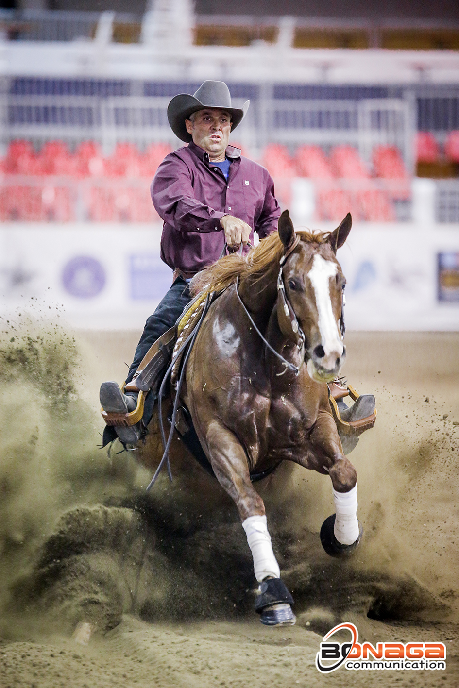 Gilles Huyghe of Belgium and Christian Baldelli of Italy—who both scored a 217.5—chose to share the €27.548,00-added L2 European Futurity Open Championship. Assistant for Fonck Performance Horses, Huyghe rode Smart Spooky Joe a gelding by NRHA Million Dollar Sire Lil Joe Cash out of Spookody, bred, owned, and nominated by Jean Louis Coutrot. “We were actually preparing him for Bernard [Fonck] to show here but we then decided that the reins would pass on to me,” said the young professional. “I am very grateful for this opportunity and am thankful that this adventure ended with a co-championship. He’s one of my favorite horses: He’s a fun horse at home, always acts really happy, and is super sweet-minded.”