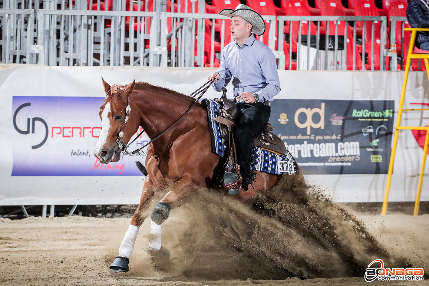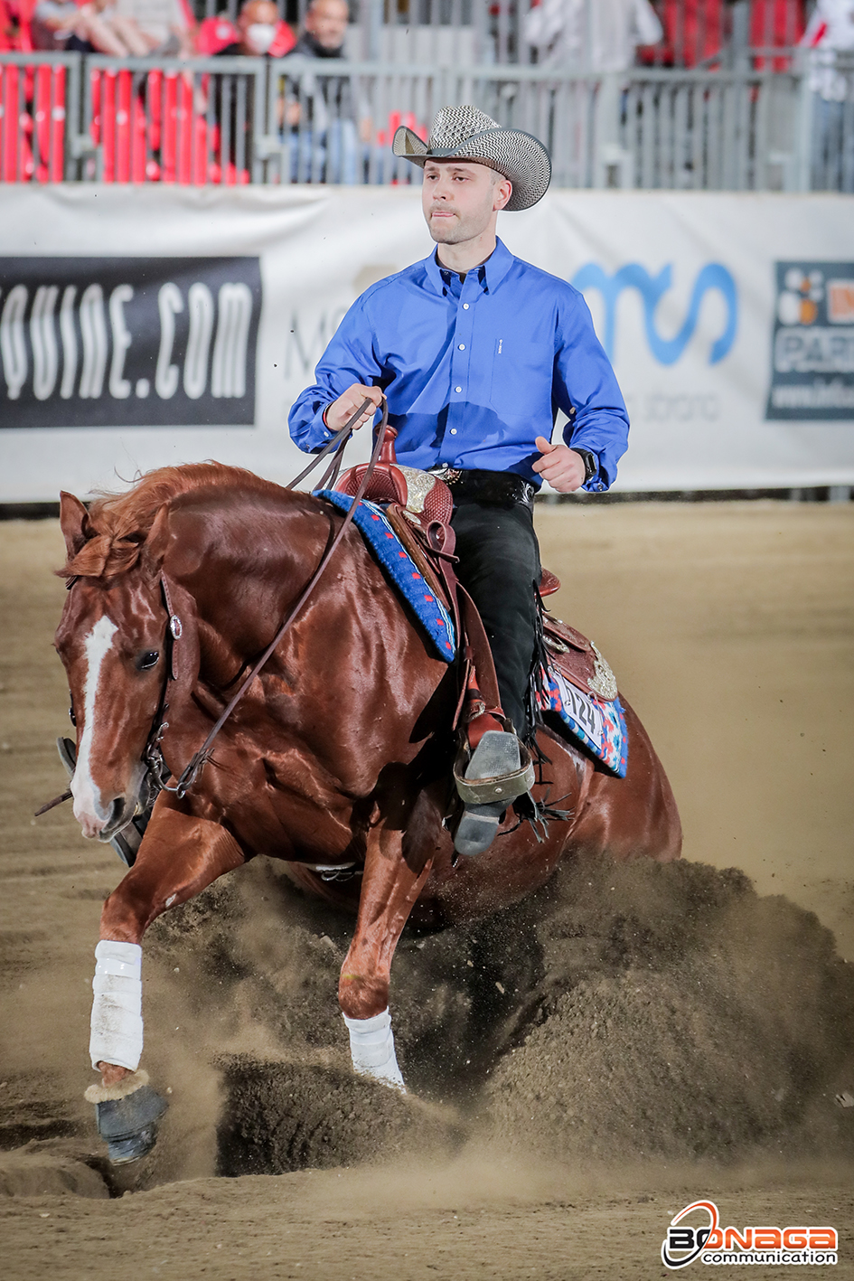 RR Branding Star, an American Paint Horse by past NRHA Open Futurity Champion RR Star out of As I Want, was originally supposed to have been shown at the Euro Futurity by his owner Melaine Cartier. In training with Andrea Costa since the end of last year, and not having had the chance to show during the pandemic, the decision that Costa would keep the reins was made. “I had never shown him prior to this event, but I’m thrilled this decision was taken,” shared Costa. “He was trained by Giovanni Masi who showed him in the 2019 IRHA Open Futurity. He’s a huge stopper, good-minded, and is very talented. We have not made future plans yet and don’t know whether it will be Melanie or me at the reins, but I do hope to show him again eventually.”