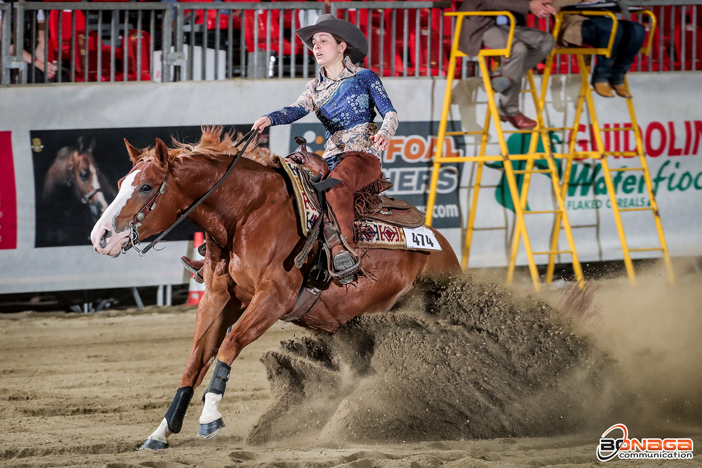 Baldelli rode Claudia Rizzola’s Step In The Night, a gelding by Saturday Night Custom out of Wimpys Surprize Chex bred and nominated by Ambrosini Quarter Horses. “It’s all really emotional and I still cannot believe that this long-awaited Futurity has finally taken place,” said Baldelli who qualified his mount for the Levels 4, 3, and 2 Finals. “It’s too bad we incurred in a penalty tonight, but I am super happy with this result for the horse and for his owners. He’s a gentle big horse with an even bigger heart we purchased last year to show in the Euro Futurity. He will probably be shown by his owner in the [IRHA] Non Pro Derby and I am hoping to be able to show him again in the near future.” The duo also took the IRHA 4-year-old L2 Open Futurity Championship.