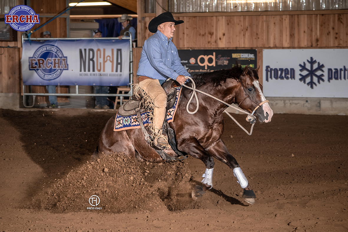 Capturing the $3.000-added ERCHA/NRCHA Open Bridle Spectacular Championship with a strong performance worth a 220.5 composite score was Markus Schopfer riding Yvonne Bonda’s Oh Cay Mc (Metallic Cat x Oh Cay Meriah).