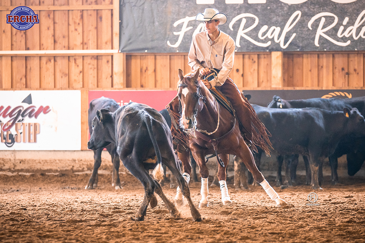 Patrick Sattler rode his own MissSparklingShowTime to the first place of the $500-added ERCHA/NRCHA Limited Open Bridle Spectacular Championship with a 211.5 composite score (rein work 69.5, herd work 70, fence work 72).