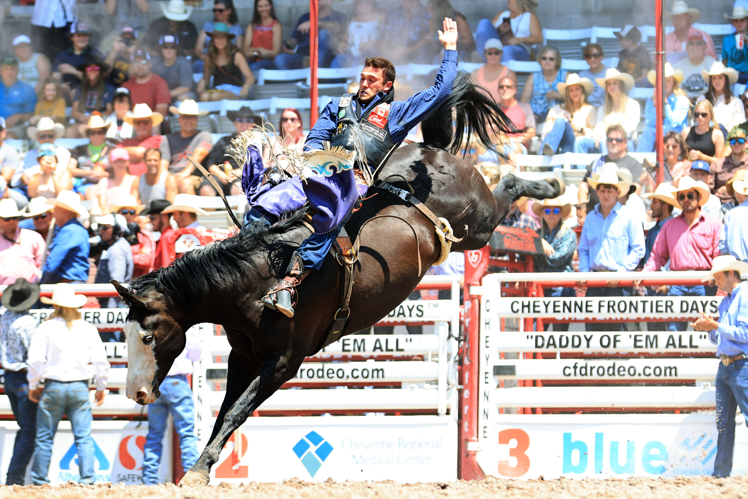 Bareback rider Caleb Bennett is having the best summer of his professional rodeo career as a bareback rider. That success continued at Cheyenne Frontier Days on Tuesday. He won Quarter Finals 4 with an 85.5-point ride on Summit Pro Rodeo’s Bald Mountain. PRCA photo by Jackie Jensen