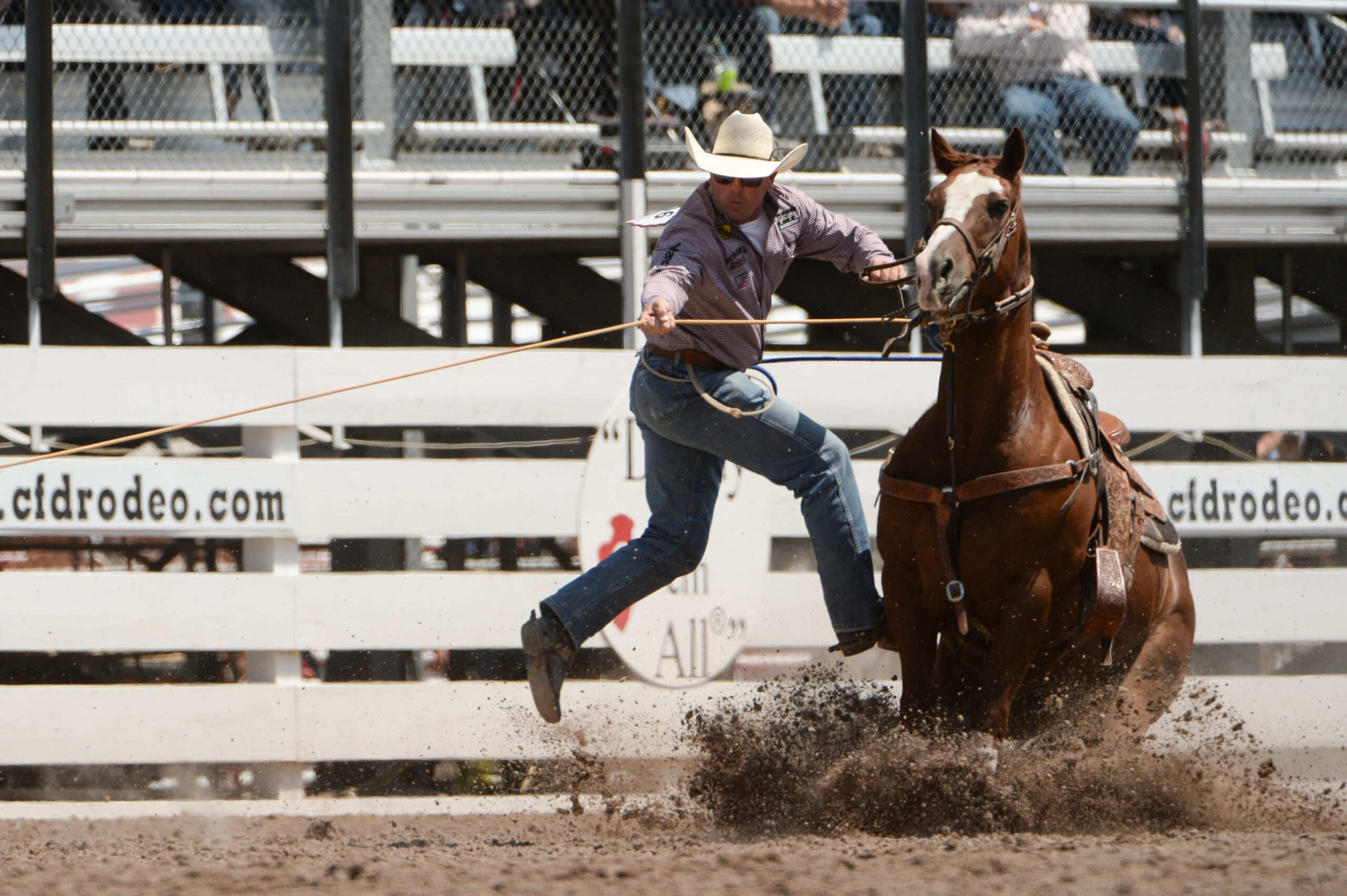 In spite of over 10 years of trying, Ryan Jarrett, from Apache, Oklahoma has yet to win a tie-down roping championship at Cheyenne Frontier Days. He stopped the clock in 11.3 seconds to win Quarter Finals 4 and is now among the Semi Finals competitors. – PRCA photo by Click Thompson