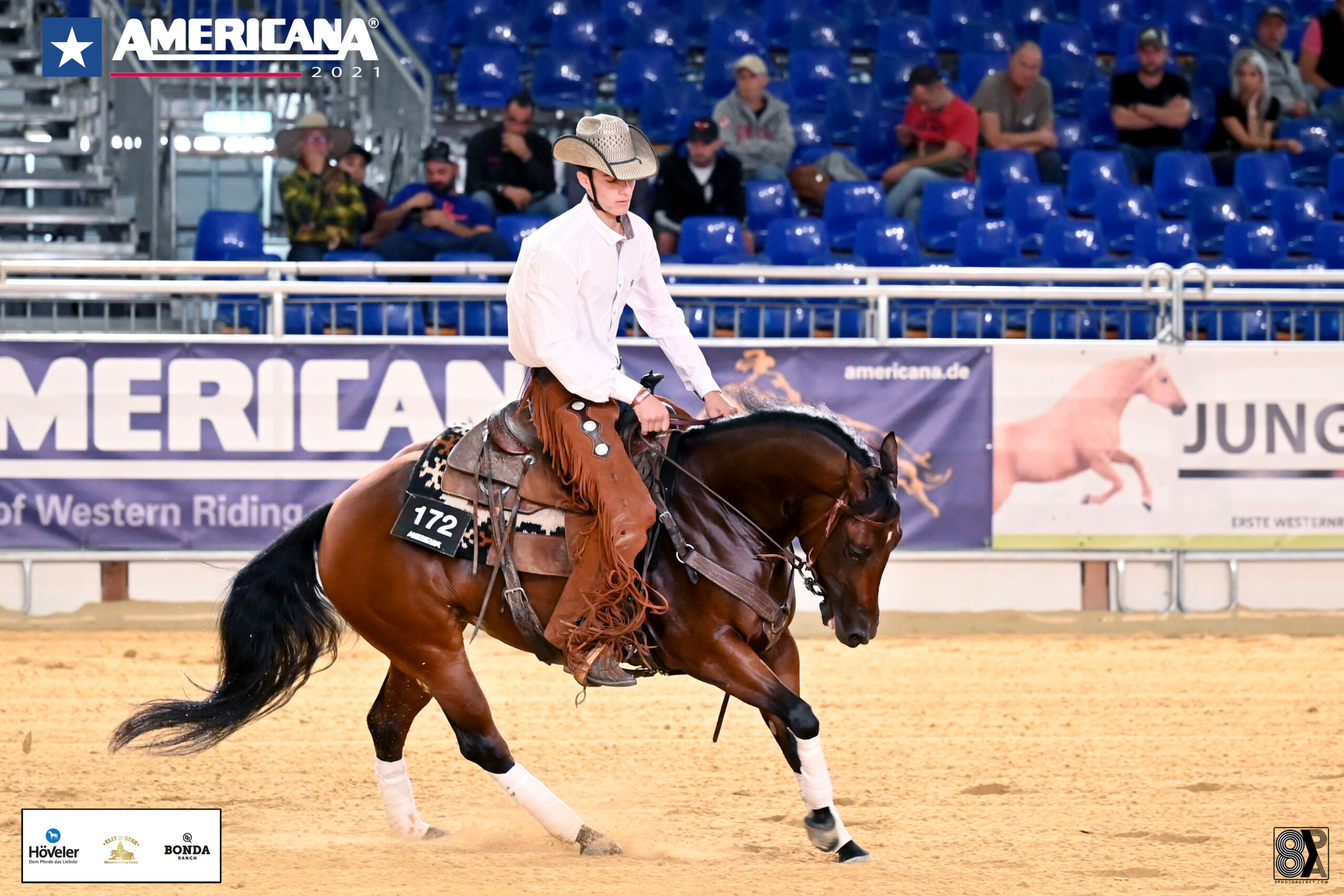 Pietro Tuberga and Katrina Hope Olena (Oaks Lone Pepto x Haida Oleana), owned by Domenico Sapino, won the 2021 €1.000-added ERCHA/NRCHA Limited Open Futurity Championship: “AMERICANA has been an amazing adventure. I’m so happy with the results, even considering that the mare I rode, who is now 3 years old, also placed third in the Open Futurity despite her young age. She’s a special one, bred by a very close friend of mine [Marco Mangano], and I’ve had her in training since she was two. Thanks to the owner, who blindly believes in my program, I managed to accomplish this great result”.