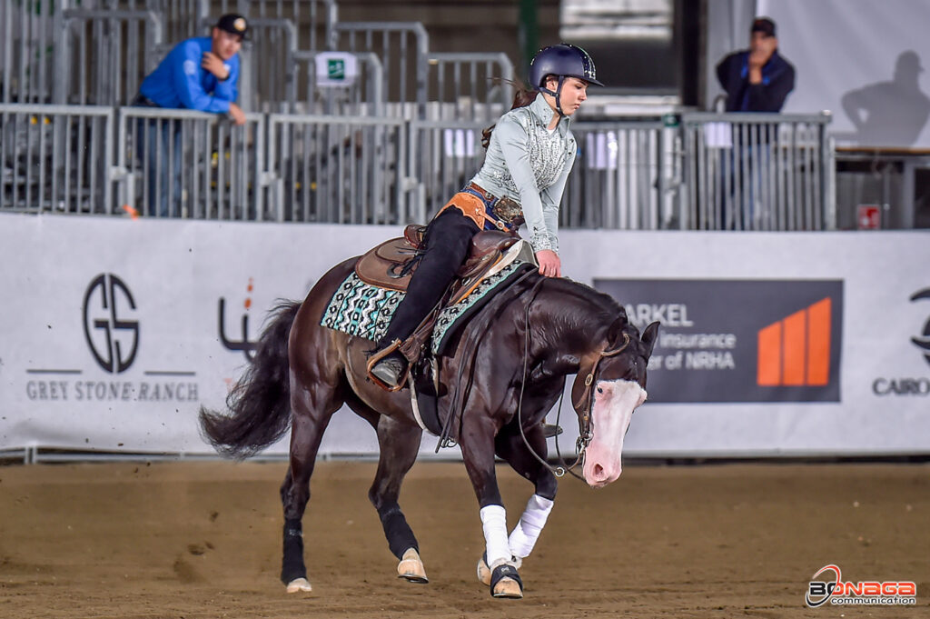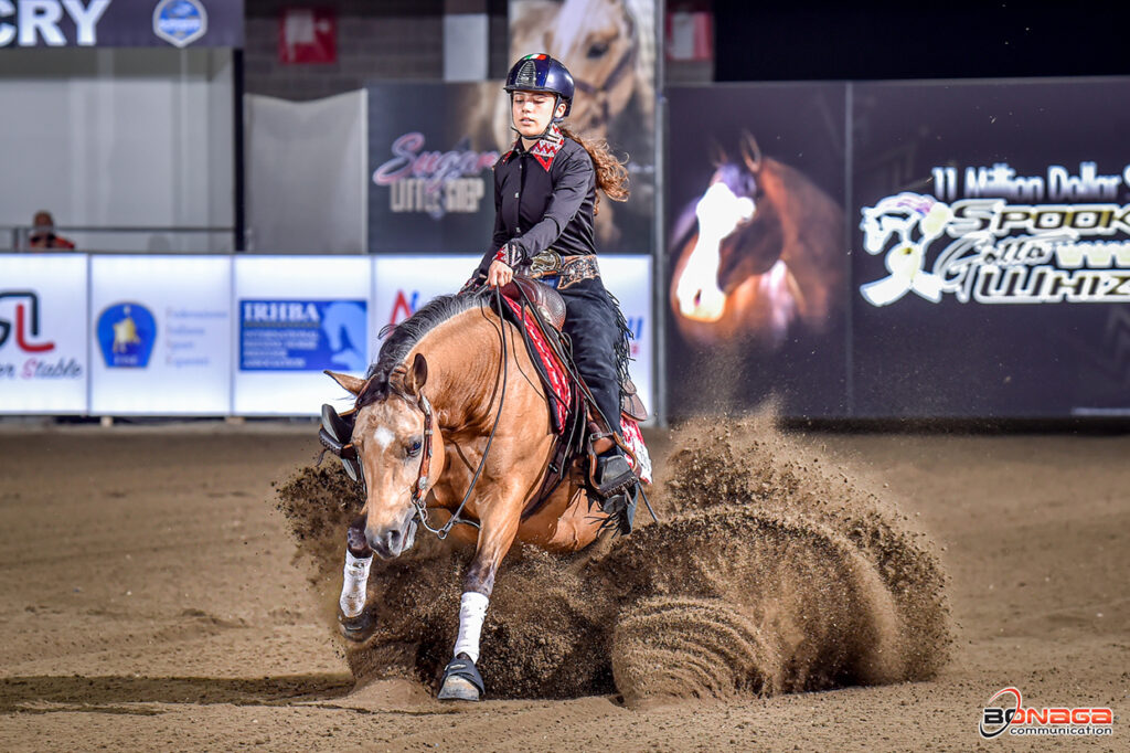 Giulia Travagli of Italy and her own FV Whiz Gotta Gun (NRHA $10 Million Dollar Sire Spooks Gotta Whiz x Miss Cocked Gun), a stallion bred and nominated by Francesco Vasanella, scored a 209.5 to lead the L2 and L1 divisions.
