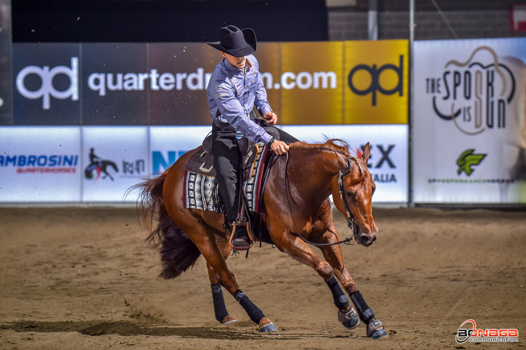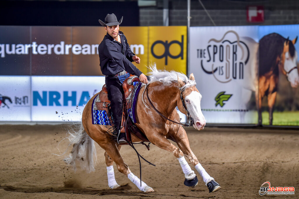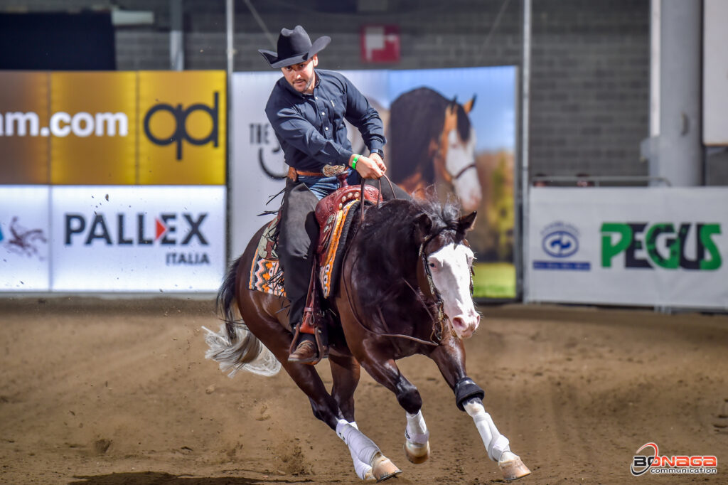 The first Open riders competing for a spot in the Finals, which will be held on Saturday, May 24, maintained a high level of competition today in the CremonaFiere arena. The highest score of the day in the first section of the European Futurity Open Qualifier was the 222 posted by Italian NRHA Professional Nico Sicuro aboard Churchill Twenty One (NRHA $15 Million Dollar Sire Gunner x Dance Little Spook), a stallion owned, bred, and nominated by Quarter Dream. The duo also lead the APHA Chrome Cash L4 European Futurity Open Qualifier.