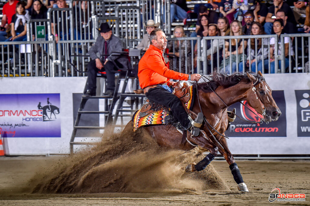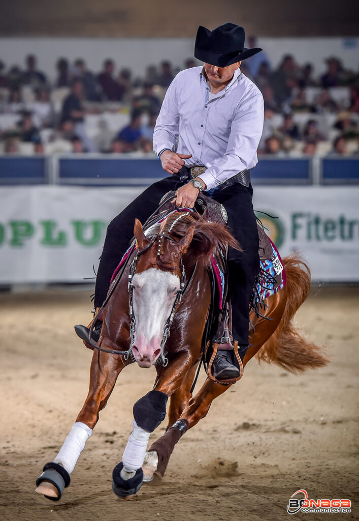 “I’ve been watching [NRHA Hall of Famer] Eleuterio Arcese and all the European sponsors putting more and more money into this show. With this horse being so strong and consistent, I knew he could handle it—even though it’s not an easy feat for a 4-year-old,” shared the four-time NRHA Futurity Champion. “Tonight, we ran in, and I knew we had to go for it. I didn’t really play it safe, but I knew he had big enough maneuvers to step up and get it done, so I was super happy about it. This win feels truly amazing.”