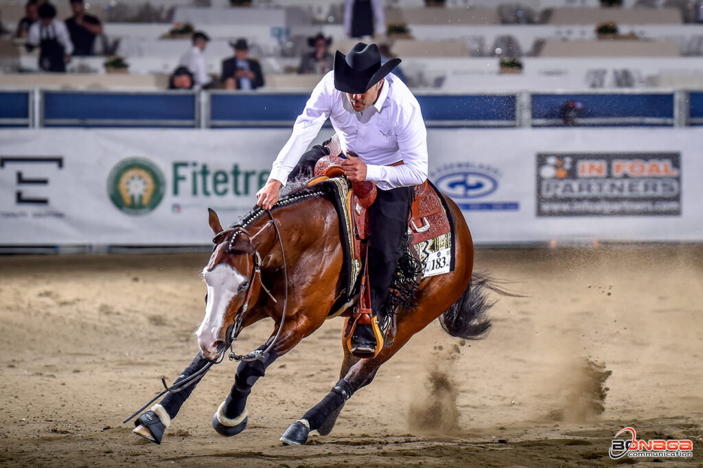 Italy’s Angelo Benedusi took to the arena aboard Dolly Face Whiz (NRHA $4 Million Sire Pale Face Dunnit x Smart Baby Whiz), a mare owned by Melissa Faraco, bred and nominated by Rodolfo Marchetti. Performing in the first section, the duo marked a solid 220 to take the lead in the L3 and L2 divisions. Their score held, earning them both the MS Diamonds TX $154,000-Added L3 and the $91,000-Added L2 Open Championships.