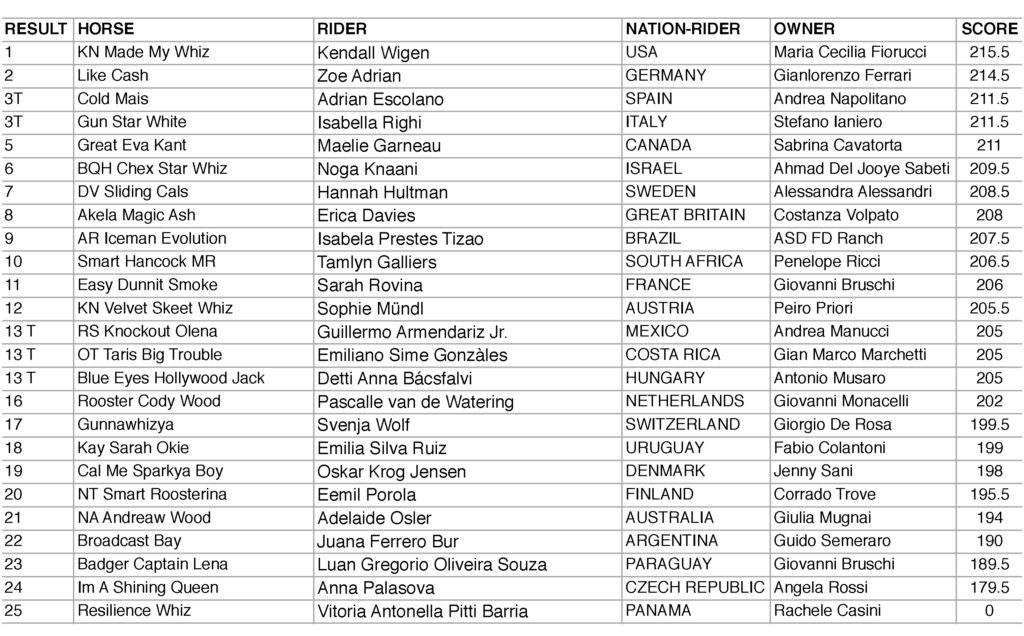 Taking home top honors, Wigen Kendall of the United States delivered an outstanding performance aboard KN Made My Whiz (Hesa Mega Whiz x Made To Surprise), owned by host Maria Cecilia Fiorucci, earning a score of 215.5. With this exceptional ride, Kendall claimed victory in the 2025 Elementa/NRHA/RHF World Youth Reining Cup.