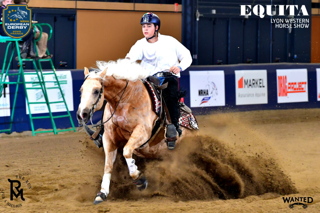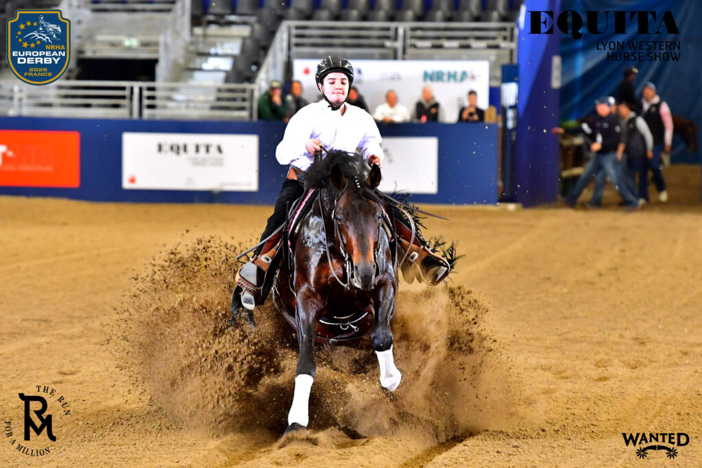11-year-old Emanuel Gebert once again proved his grit, focus, and talent in the show pen. Riding Spooksgottacoolstep (NRHA $12 Million Sire Spooks Gotta Whiz x Charly Step N Cool), a 7-year-old stallion owned, bred, and nominated by his mother Angelika Gebert, he closed the day taking home the L3, L2, Reserve Championship in L4, and $2,000-Aded NRHA France Youth Derby. “He is such a nice horse, I really enjoy showing him. Today I especially liked our left turns and the last stop was amazing as well. This arena is nice to ride in, so I am happy that we won here.”