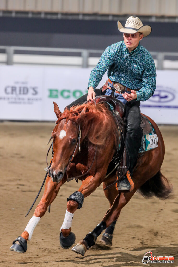 Leading the pack in the $240.500-Added Level (L)4 was Italian NRHA Professional Nico Sicuro who, with Mobster N Spook between the reins, laid down an impressive 223.5. The stallion by NRHA Million Dollar Sire HF Mobster and out of Dance Little Spook, is bred and owned by Quarter Dream.