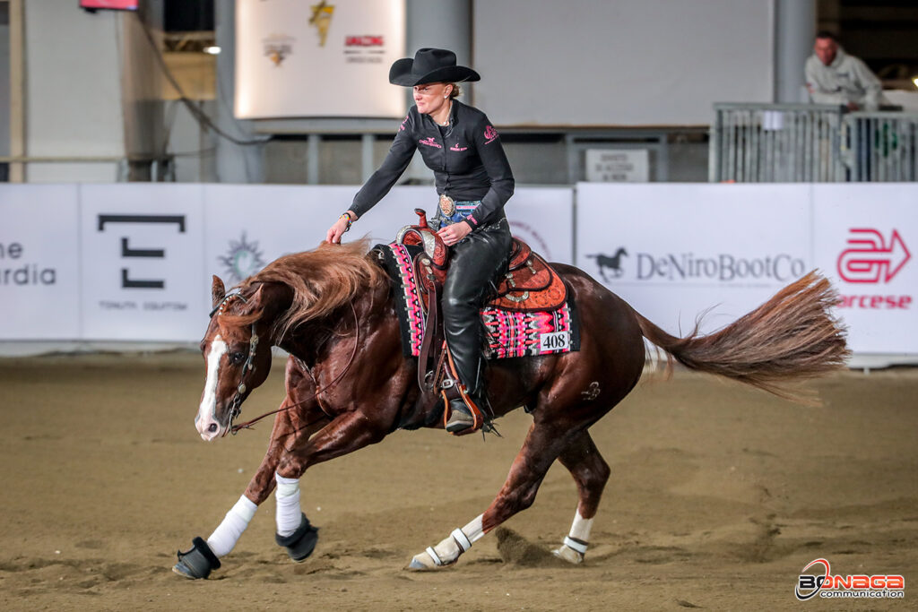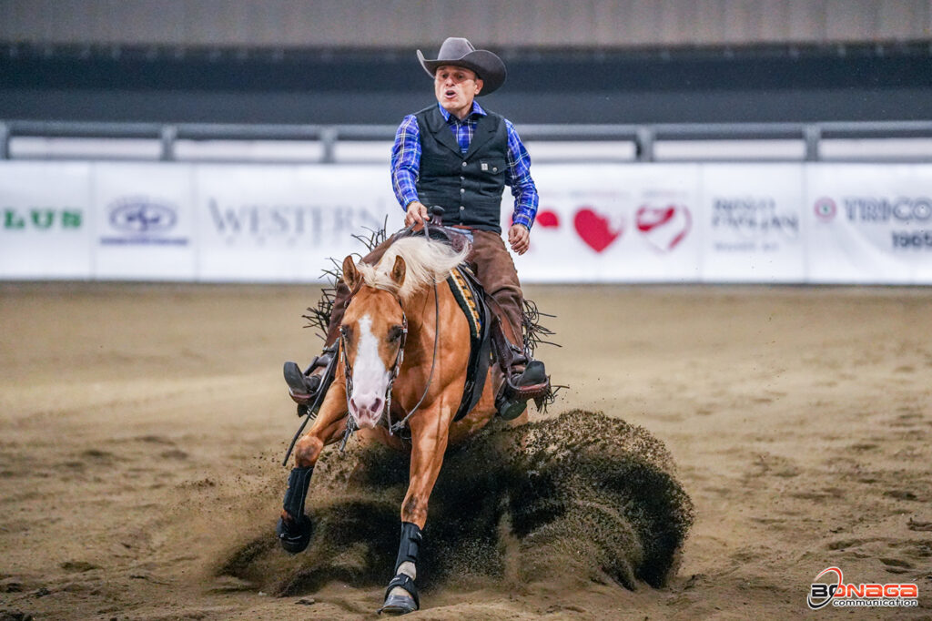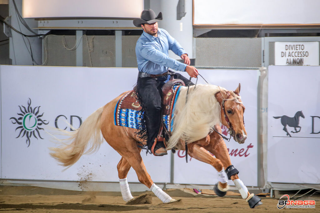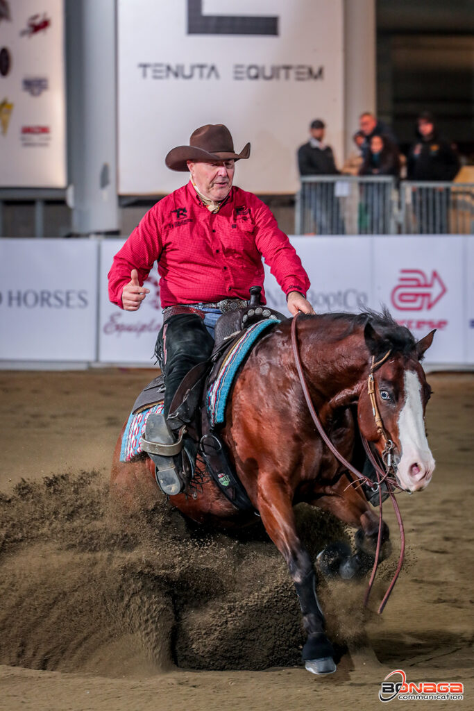 In the $65.000-Added L3, tying for the high score (220.5) was Germany’s Kim Obenhaus riding Bo Brutsaert’s KB By Davinci (NRHA $ 4 Million Sire Inferno Sixty Six x Pumpkin Rooster), a stallion bred by Bruko Quarter Horses and owned by Koen Brutsaert; and Pierluigi Fabbri of Italy with The Force Is Back (Maytheforcebewithyou x Great Eva), a stallion bred and owned by Antonio Pedron. The latter also leads the $32.500-Added L2. (Photo below).