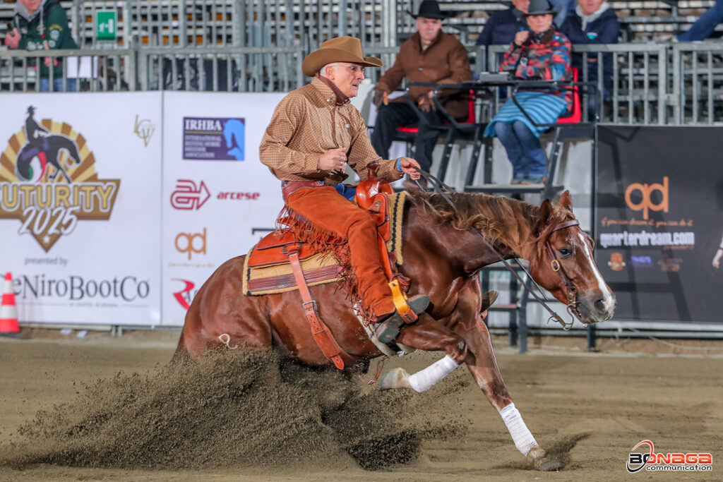 Cremona, November 9—The $700.000-Added IRHA/IRHBA/NRHA Futurity on Sunday welcomed the second section of the Quarter Dream $353.600-Added IRHA/IRHBA/NRHA 3-year-old Open Futurity first go round counting 134 horse-rider combinations entered across the four levels. On top, with a 223.5, was Nico Sicuro with Mobster N Spook, a stallion owned and bred by NRHA Million Dollar Owner Quarter Dream.